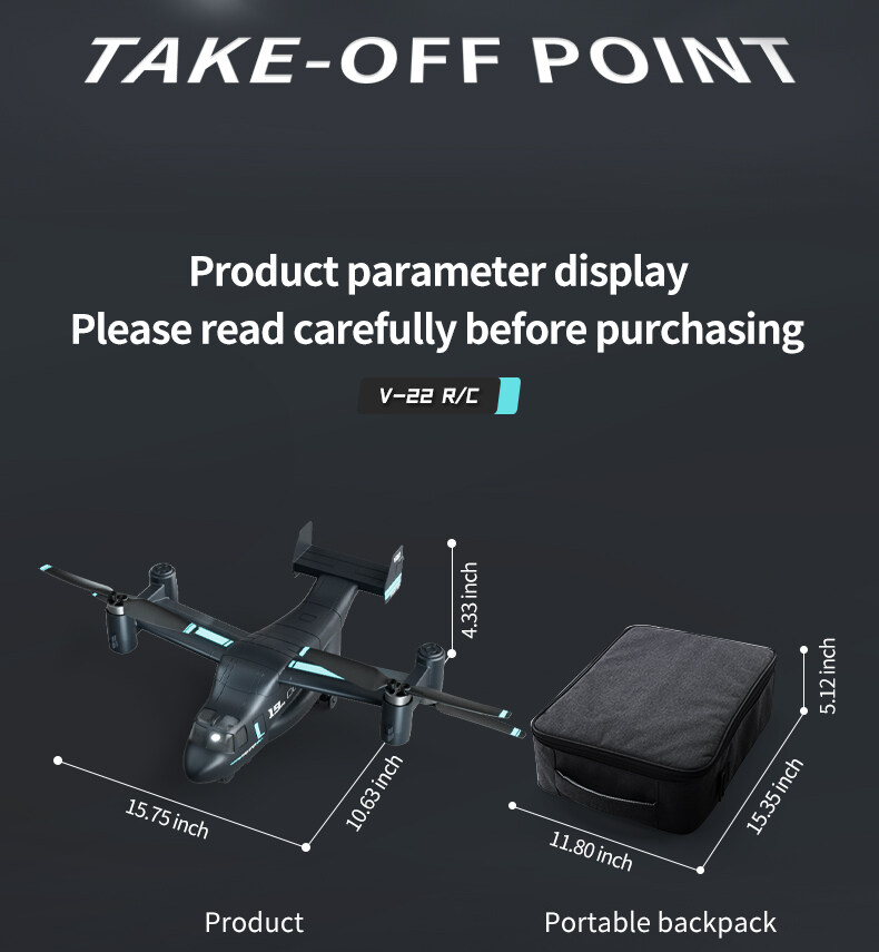 RC V-22 Osprey Drone Describe Product Name: RC V-22O Osprey Drone Camera with GPS Color: dark gray Product size(cm): 40*27*11cm(L*W*H) product weight: Aircraft 315g, remote control 124g Packe: Backpack + Box Backpack size : 42*31*13.8cm Battery Type: polymer battery Battery parameters: Play time: about 18 minutes Charging time: 120 minutes Charging mode: USB Battery for Remote control: 3 AA (not included) Remote control distance: 800m Remote control height: 120m Gharging line protection measures:None, conventional 2A environmental protection Android cable Product battery protection measures: Charging protection and short circuit protection