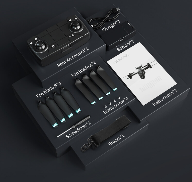What’s in the box: Drone *1 Wind blade *8 Fan blade screw *4 screwdriver *1 Charging cable *1 Product Operation Manual *1
