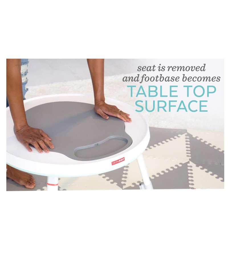 Designed to grow with baby in three stages, Skip Hop's Silver Lining Cloud Baby's View Activity Center is an action-packed take on our best-selling gym. Feauturing the same developmental approach to play and learning as our Explore & More version, the dcor-friendly design features a 360-degree rotating seat that turns and stretches for bouncing. Our unique Discovery Window gives little ones a clear view of their feet as they play the light-up piano to connect cause and effect. Four dreamy toys can be rearranged for customized play. As baby grows, the activity center converts for easy cruising. At stage three, it transforms into a sturdy toddler table with a plastic chalkboard surface for drawing, playingthe sky's the limit!
