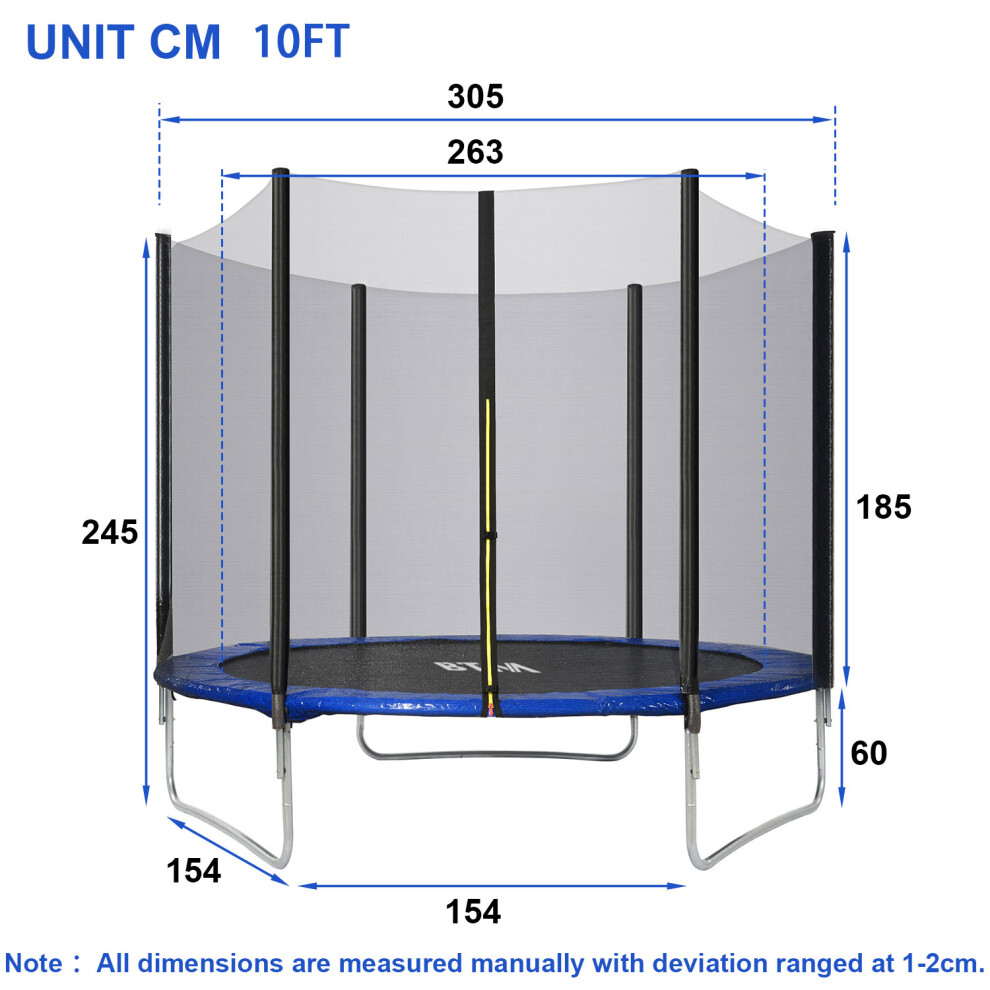 Outdoor Workout PartnerOur trampolines with enclosure package provide different dimension of 6ft, 8ft,10ft,12ft and 14ft. All trampolines give you an ample amount of room to bounce on. This outdoor trampoline's a big fun factor for kids, adults and is perfect for relieving stress and working out your body, promoting stamina, motor skills.Fully Considered SafetySteel U-Shaped Legs manufactured with rust-resistant galvanized steel (40 x 1.5mm), the U-shaped base leg system firmly stabilizes and supports the entire trampoline from every angle for your safety, user weight up to 100 kg (for 6FT max.50 kg. 6 foam-padded safety poles prevents accidentally hitting.Durable ServiceHeavy-Duty bounce mat is manufactured with high UV protection from polypropylene, increasing strength, and designed to last for years to come outdoors, comes with a safeguard thick foam covering pad. Fully equipped trampoline designed for premium safety, quality bouncing, and durability.High-Quality StructureHigh-quality springs evenly distribute the weight, provide safe cushioning and excellent elastic force. Premium steel rust-resistant net support poles are highly durable connected with steel joint bonding in 2 areas for unmovable support preventing structural twisting and securely holding up the safety net.Fully Equipped & Friendly AssemblyAll Accessories Included - Premium UV protected bounce mat, heavy duty galvanized steel ladder, netted safety enclosure,spring pulls and necessary tools. Designed for user-friendly assembly with no drilling required. 6ft / 8ft is for kids and the 10/12ft are more designed for teenagers and adults, while the 14ft is better for family.Details